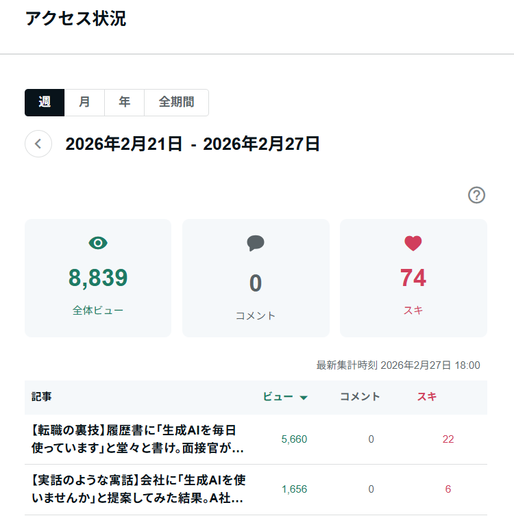 1週間の全体ビューが8,839。そのうち1本の記事だけで5,660ビューを叩き出したのです。